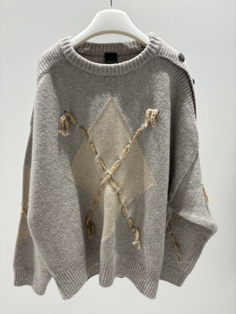 Loose fitting, cashmere sweater by Italian designer Lorena Antoniazzi with a diamond pattern on the front adorned with a lurex braid.