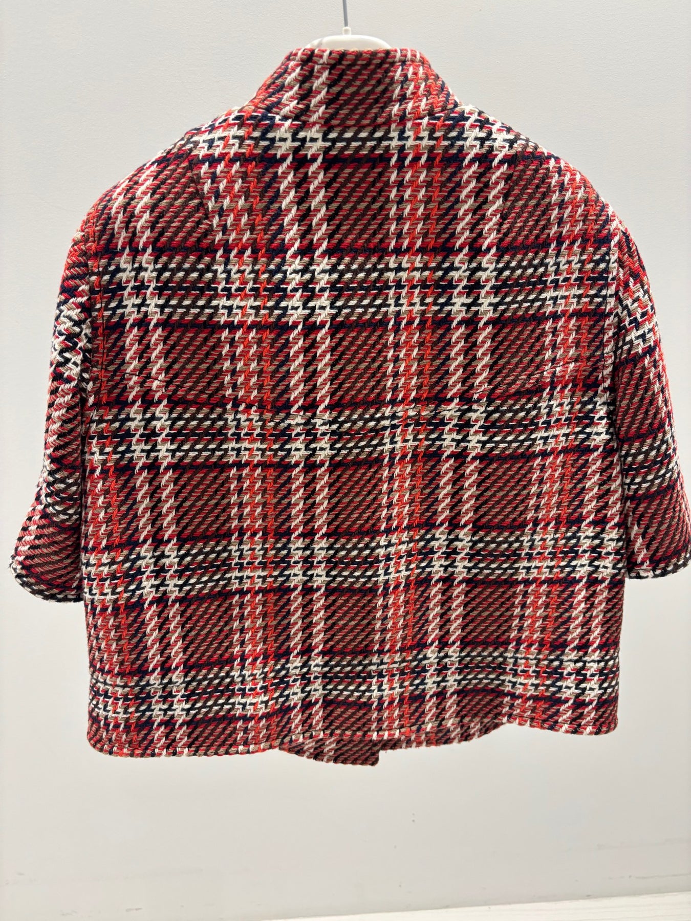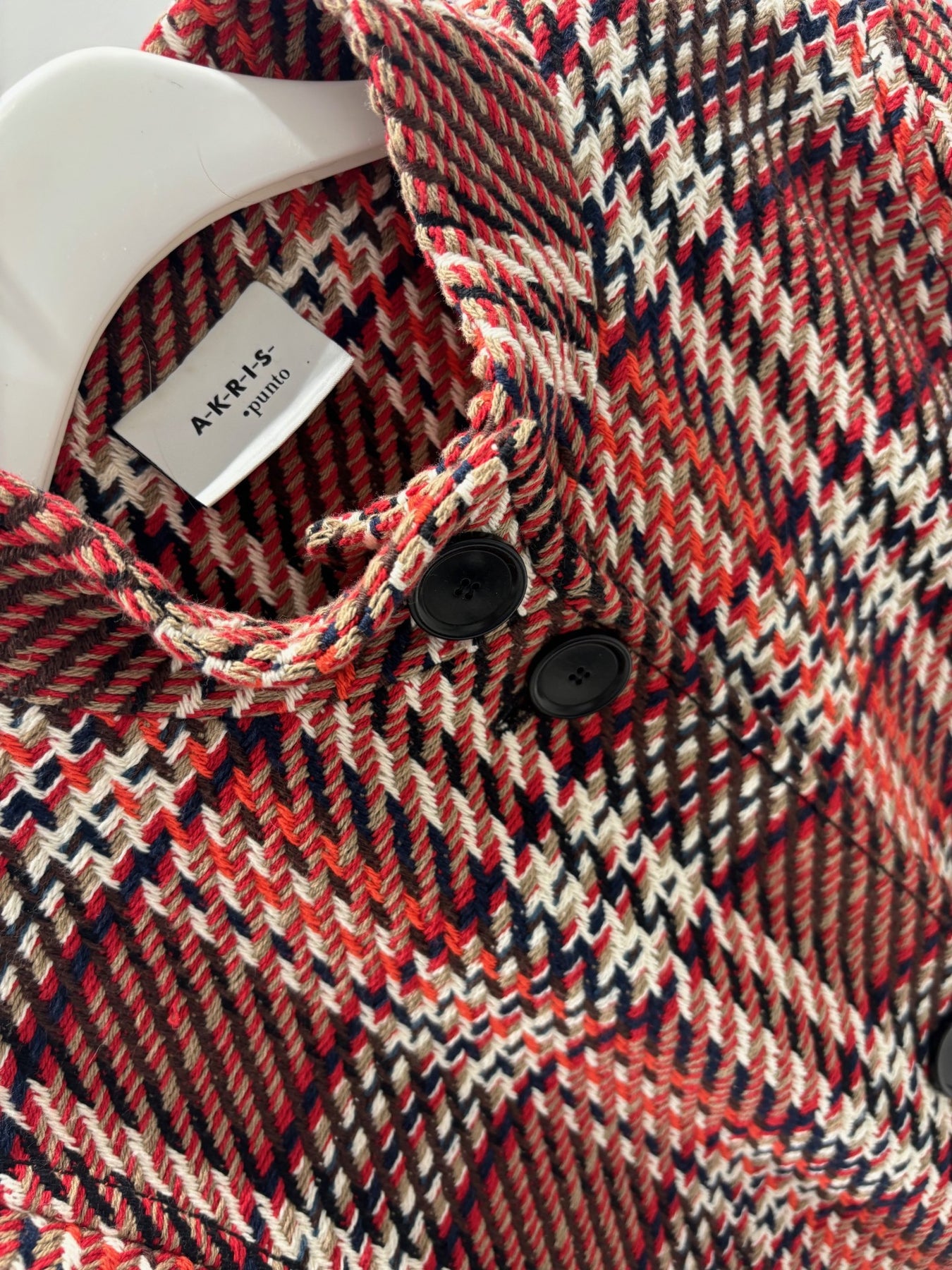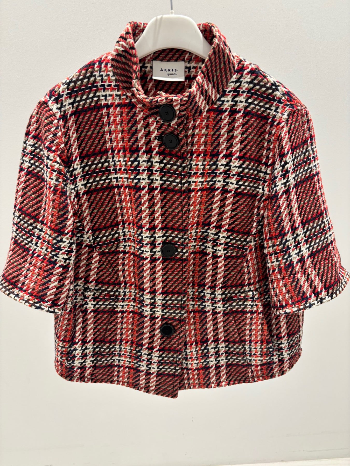 Jacket by Akris Punto with an all over check pattern. The jacket sports a stand up collar, 3/4 sleeves and large contrasting buttons.