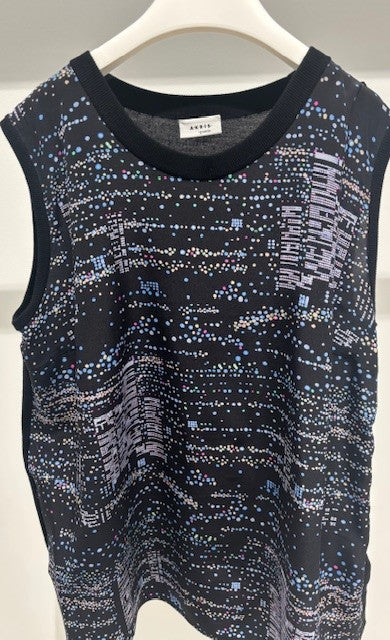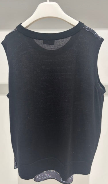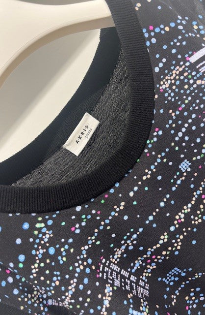 Top by Akris Punto with a silk front patterned with a night skyline print and a knit back. The top also has a black metal snap detail down one side.