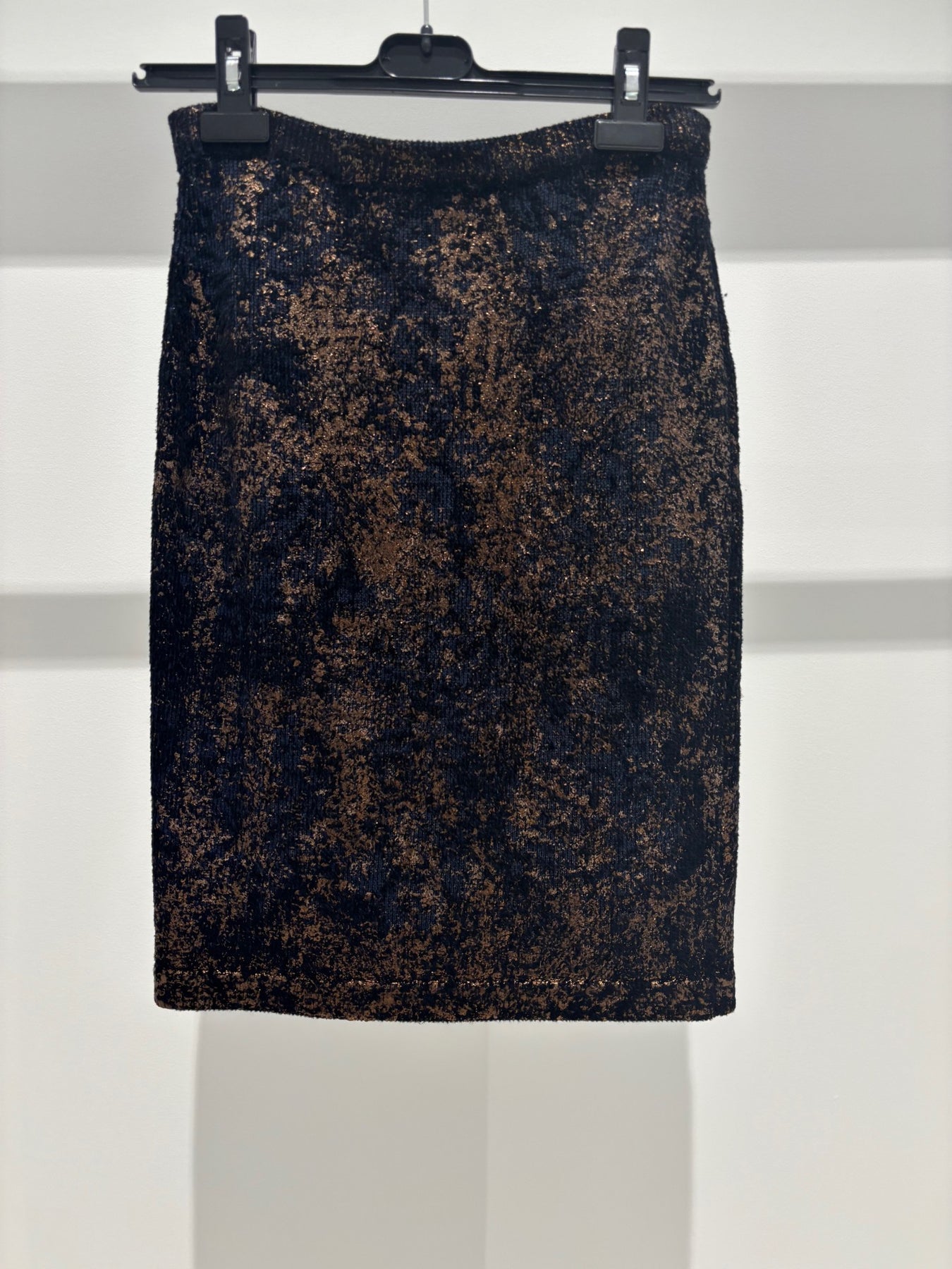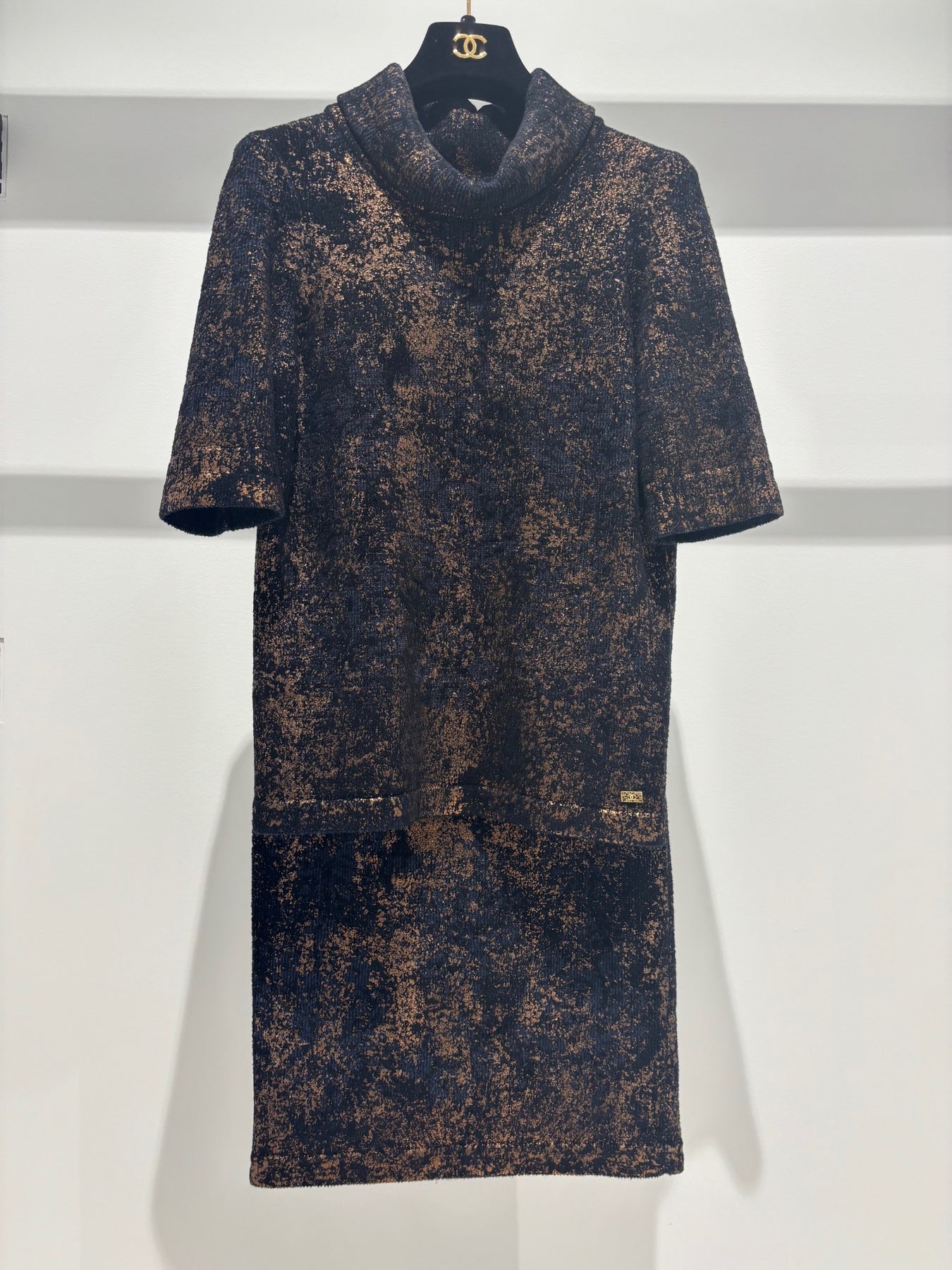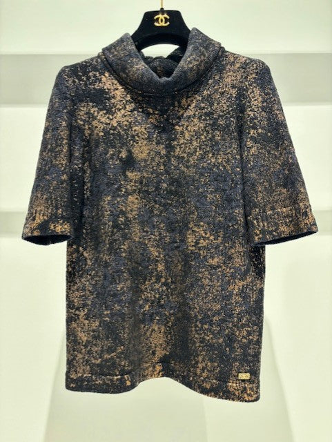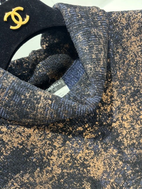 Exquisite top and skirt by renowned designer brand Chanel with an all-over unique splash print in burnished copper, navy and black. The top has a small cowl neckline and short sleeves. The skirt is knee length and straight cut.