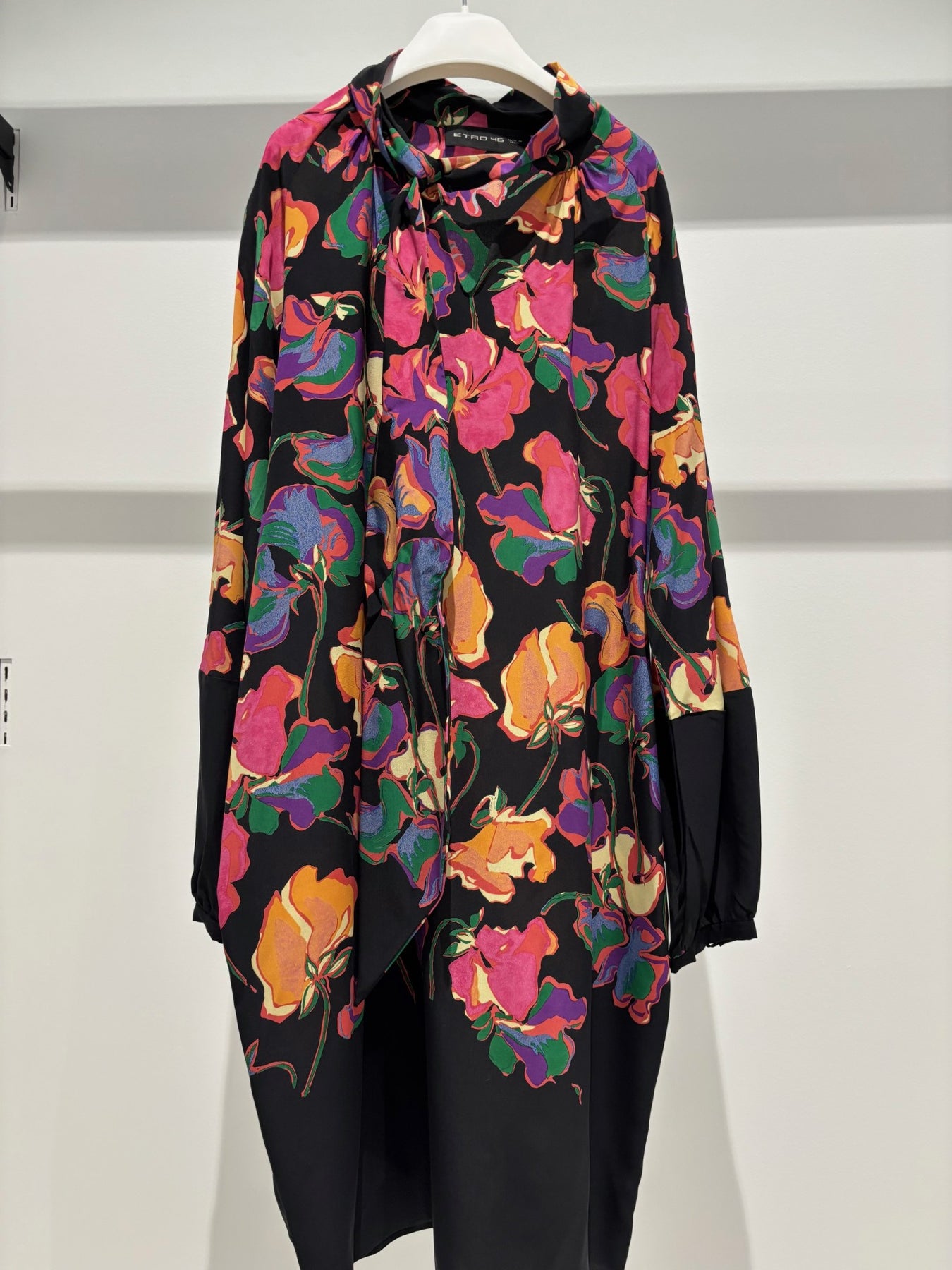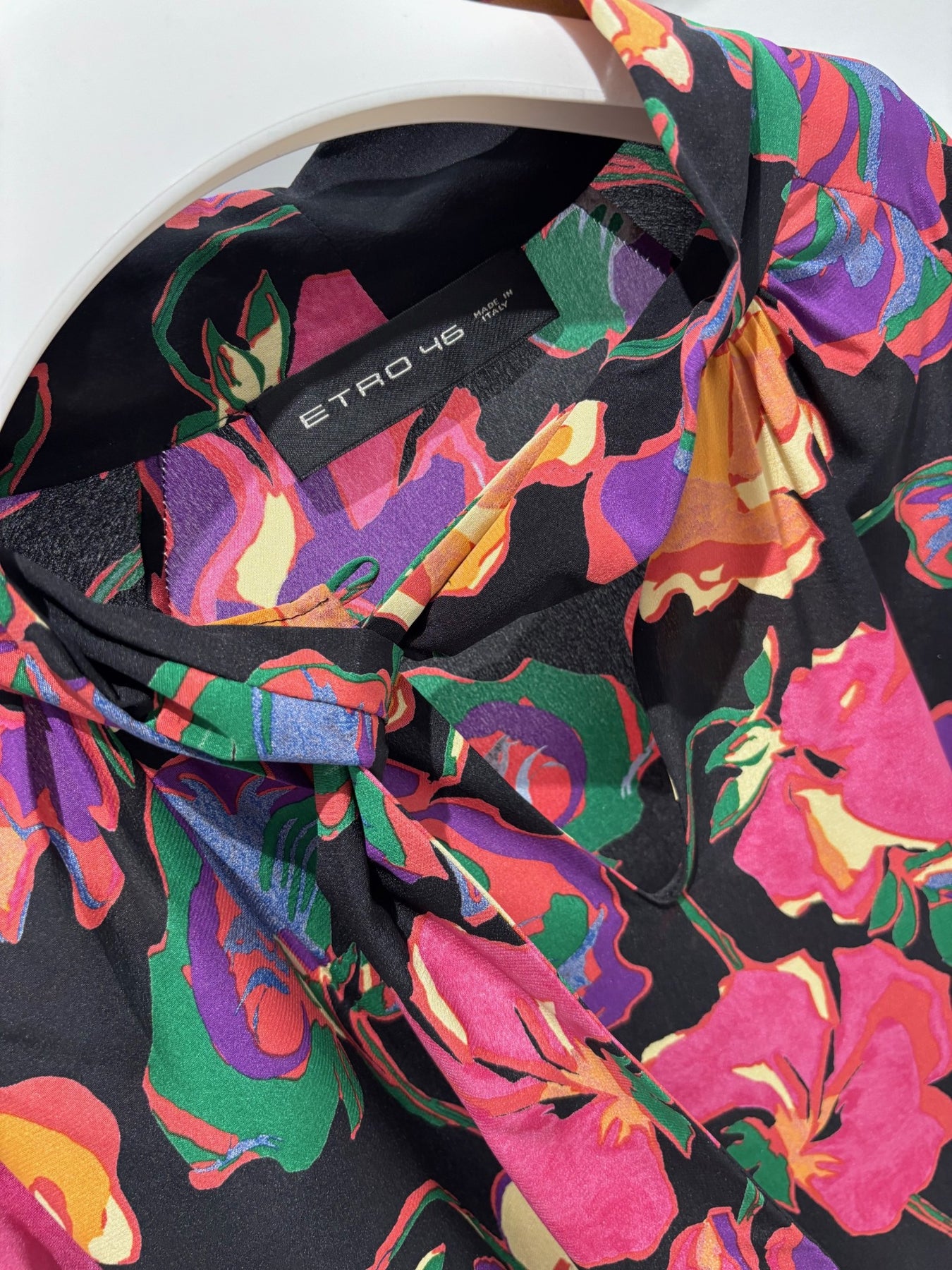Floral silk dress by Italian designer ETR0 with long balloon style sleeves and a rounded neckline with tie.